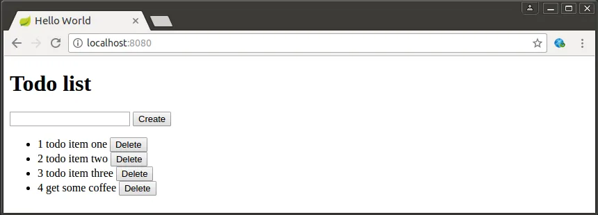 You create a new todo item by typing text and clicking “Create”. Right after it, the list of items gets reloaded from server. You delete an existing item by clicking “Delete” button next to it. Again, the list of items gets reloaded after it.