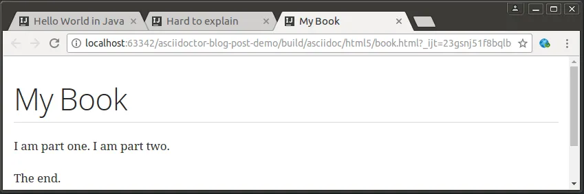 It’s usually hard to write a large document with Markdown. Markdown doesn’t have tools to combine a few smaller documents into a single one. Asciidoctor helps you to build larger documents from smaller ones using the include directive: