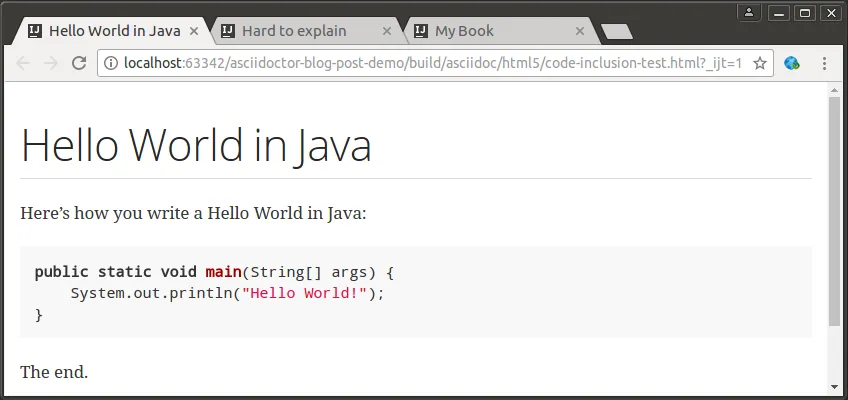One of the popular use-cases for Markdown is technical blogging. You write some text that explains what problem you had, you show a piece of code, and then explain how it solves the problem. With Markdown, you have to copy that code into your Markdown markup. With Asciidoctor your can really include the code without copying: