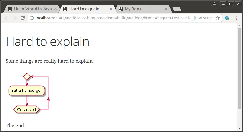 One of the nice Asciidoctor extensions is asciidoctor-diagram. This extension allows you to use PlantUML right inside your document, so that you don’t have to jump back and forth between text editor and diagram editor: